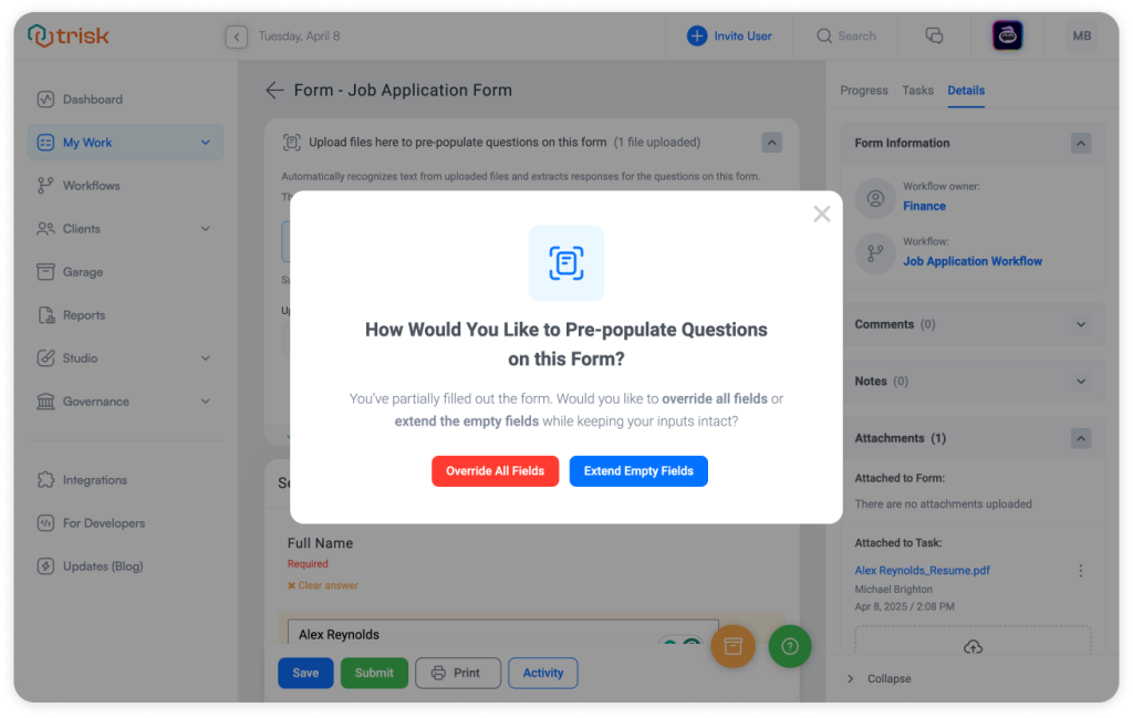 You’re onboarding a new client and receiving their paperwork. Instead of copying over details like name, birthdate, contact info, and address field by field, you upload the document. Trisk’s OCR scans it, detects the answers, and pre-fills the form for you—within seconds.