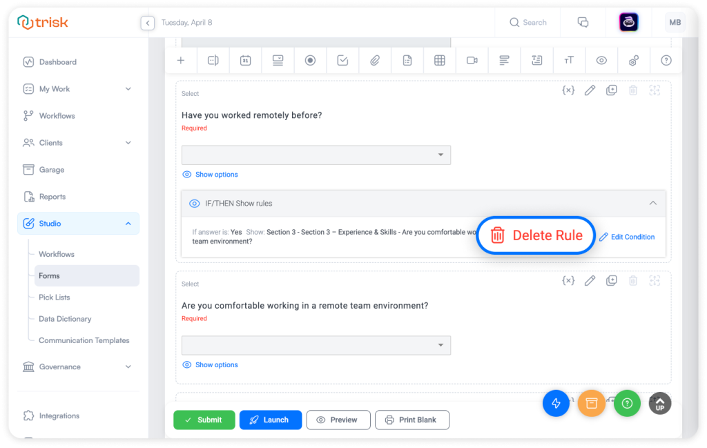 Managing conditional logic just got easier. With our latest update, removing IF/THEN Rules—whether they control field visibility (IF/THEN Show) or connect tasks (IF/THEN Connect)—is now faster, more intuitive, and fully in context.