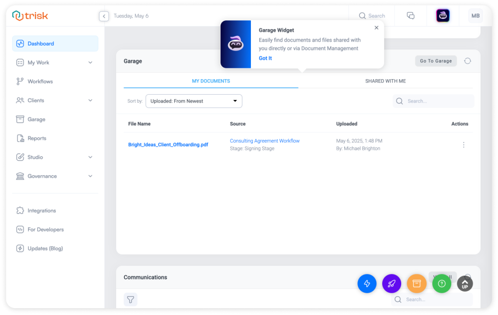 The new Garage Widget gives you instant access to the 10 most recent files shared with you or connected to Document Management tasks. Whether you’re reviewing contracts, sending client forms, or signing approvals, it’s all there, sorted, labeled, and just a click away.